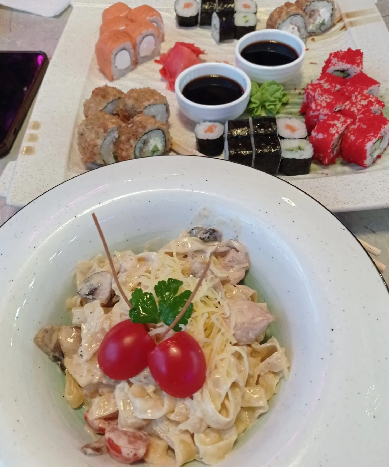 В целом все вкусно! Свежие отпадние роллы, фетучини не много